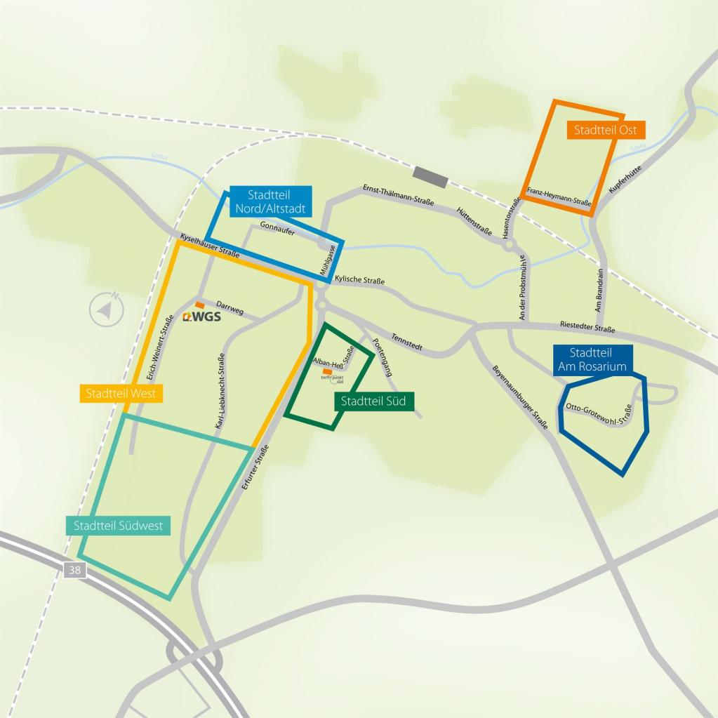 Der Stadtteil West ist eine gepflegte Wohngegend von Sangerhausen. Durch die ruhige und dennoch zentrale Lage ist diese besonders interessant. Einkaufsmöglichkeiten, Gaststätten, Apotheken und medizinische Einrichtungen finden Sie im näheren Umfeld. Auch Spielplätze, Schulen und Freizeiteinrichtungen sind in wenigen Minuten gut zu Fuß zu erreichen.