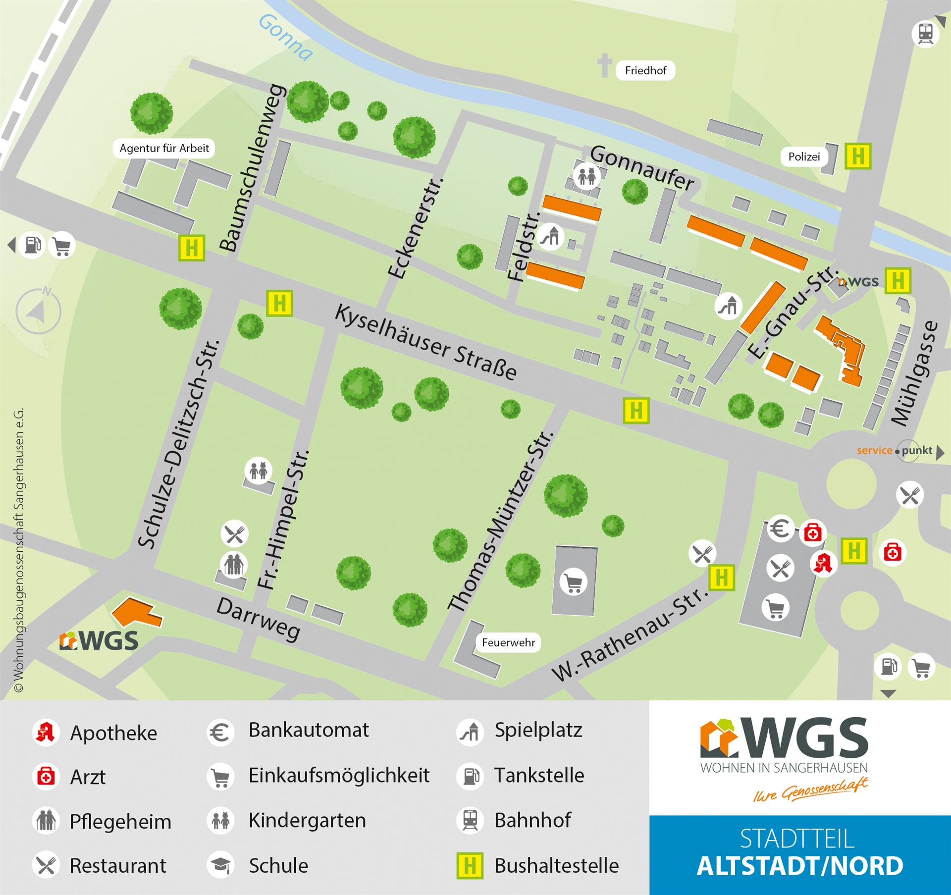 Der Stadtteil Nord liegt ruhig und zentral unweit der schönen Innenstadt von Sangerhausen. Das Stadtzentrum mit Geschäften für den täglichen Bedarf, wie Bäckereien und Einzelhandelsgeschäfte, Apotheken, medizinische Einrichtungen, Gaststätten und Freizeitmöglichkeiten, sind fußläufig in nur wenigen Minuten erreichbar. Auch eine Kita befindet sich zentral im Wohngebiet.