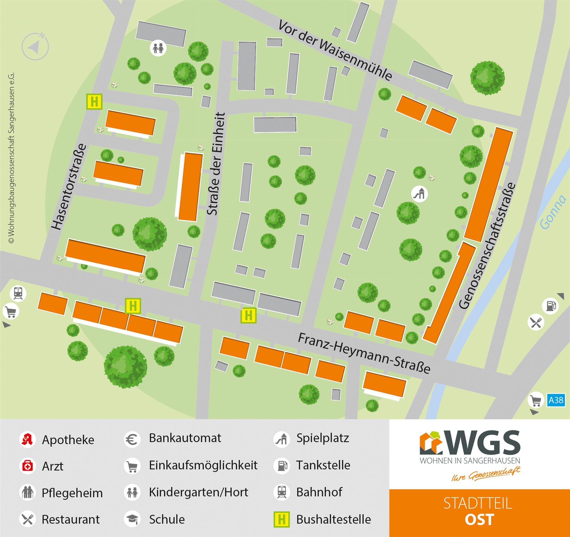 Der ruhige und dennoch zentrumsnah gelegene Stadtteil Ost besticht durch reichlich Grün mit parkähnlichen Erholungszonen und Spielplätzen. Die bauliche Struktur hat den Charme einer gemütlichen Eigenheimsiedlung. Eine gewachsene Infrastruktur mit Einkaufsmöglichkeiten, ärztlicher Versorgung, einem Kindergarten und einer Sekundarschule in der näheren Umgebung sind weitere Pluspunkte.