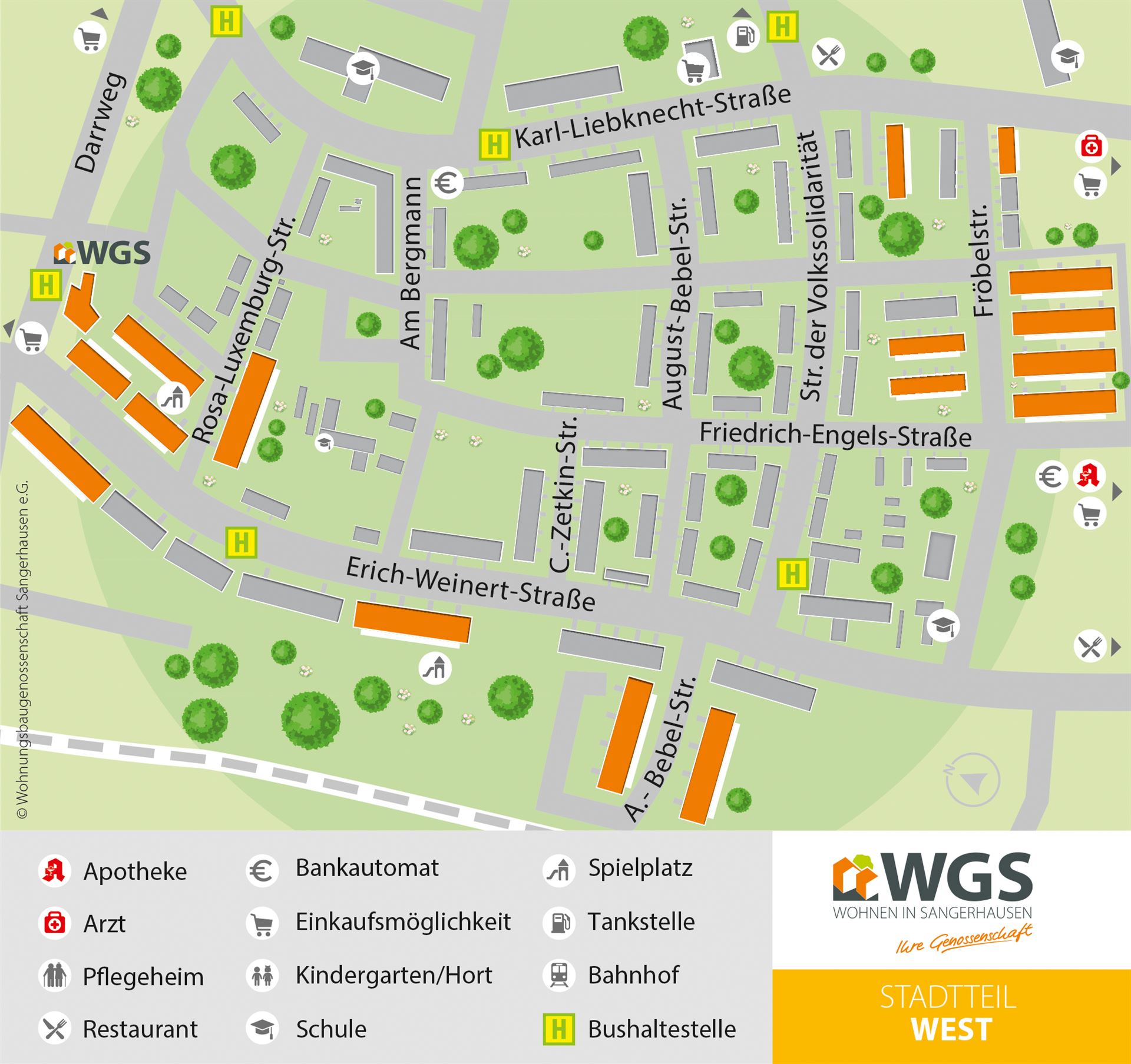 Der Stadtteil West ist eine gepflegte Wohngegend von Sangerhausen. Durch die ruhige und dennoch zentrale Lage ist diese besonders interessant. Einkaufsmöglichkeiten, Gaststätten, Apotheken und medizinische Einrichtungen finden Sie im näheren Umfeld. Auch Spielplätze, Schulen und Freizeiteinrichtungen sind in wenigen Minuten gut zu Fuß zu erreichen.